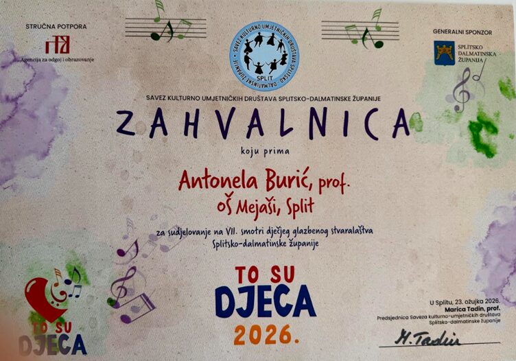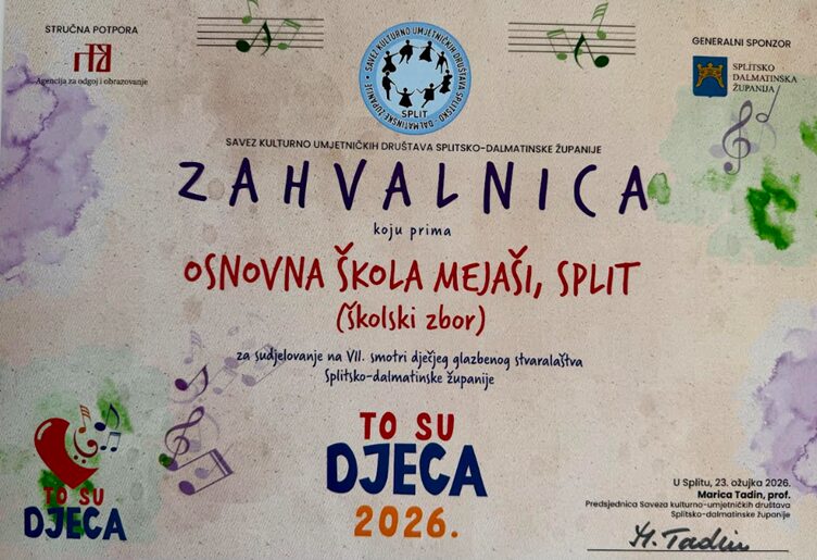 Samo dan nakon povratka s međunarodnog natjecanja na kojem se zbor okitio još jednom zlatnom nagradom, mladi su pjevači ponovno zasjali – ovoga puta na Županijskoj smotri dječjeg glazbenog stvaralaštva održanoj u Hrvatskom domu. Unatoč umoru od puta zbor je s iznimnom energijom i glazbenom zrelošću sudjelovao u natjecateljskom dijelu programa, koji je ujedno služio kao kvalifikacijska razina za državno natjecanje. Posebno je vrijedno istaknuti da je Pjevački zbor Osnovne škole „Mejaši“ bio jedini zbor osnovnih škola iz cijele Splitsko-dalmatinske županije koji je sudjelovao u natjecateljskom dijelu smotre.
